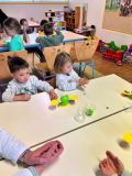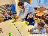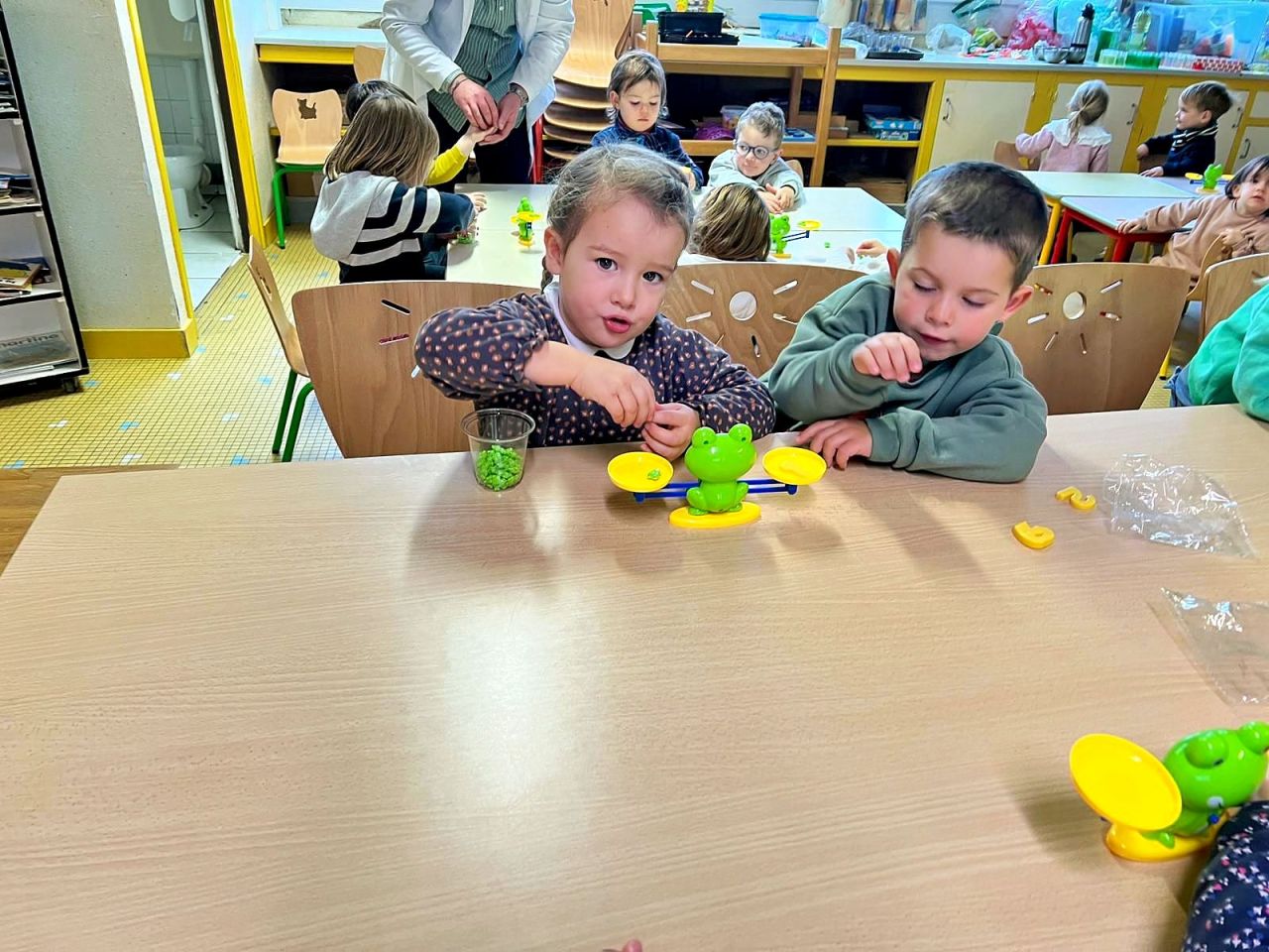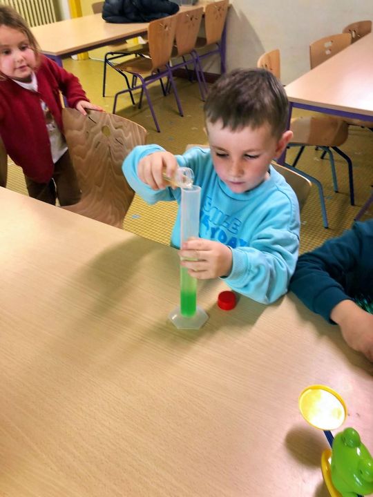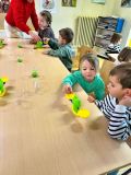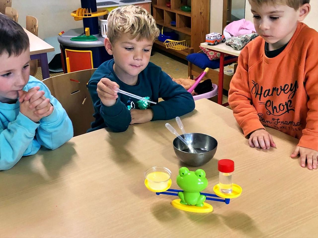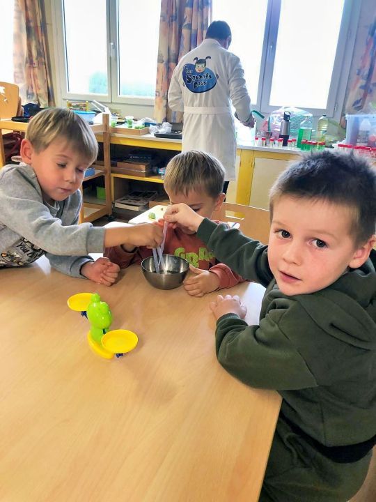 La séance s’est poursuivie avec une expérience autour de la comparaison de la masse des objets. À l’aide d’une balance, les enfants ont observé et comparé le poids de différents objets et liquides.